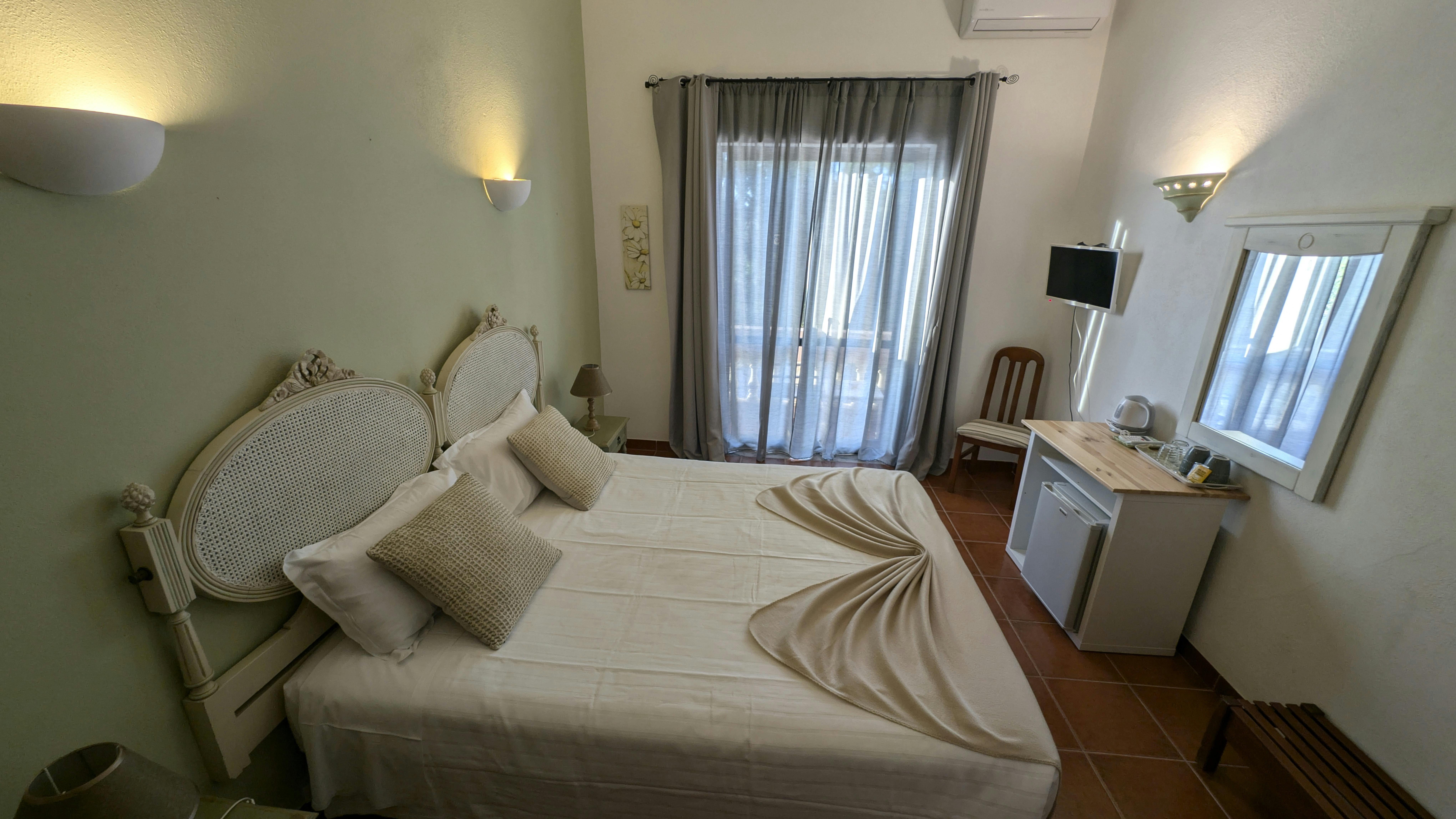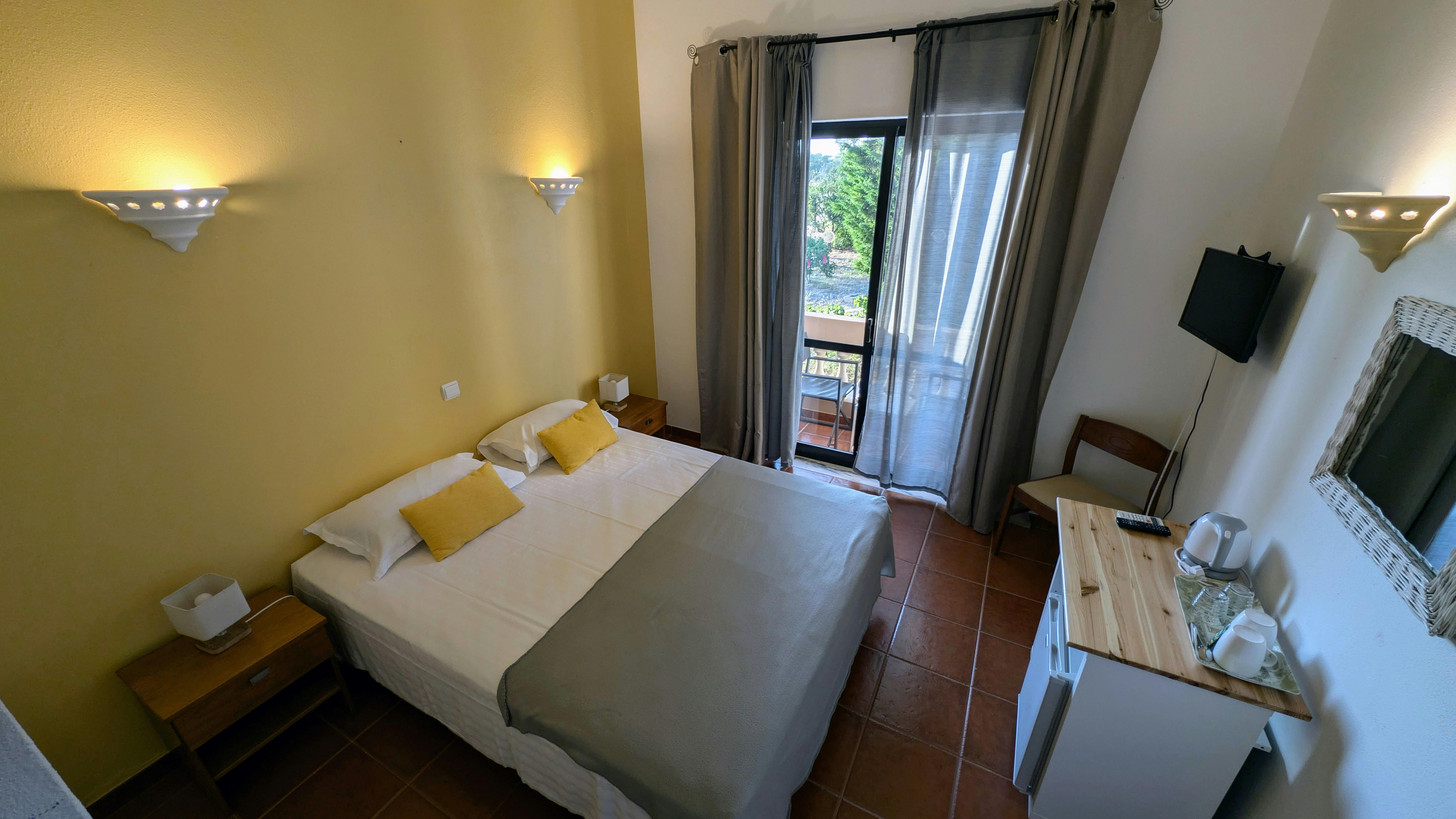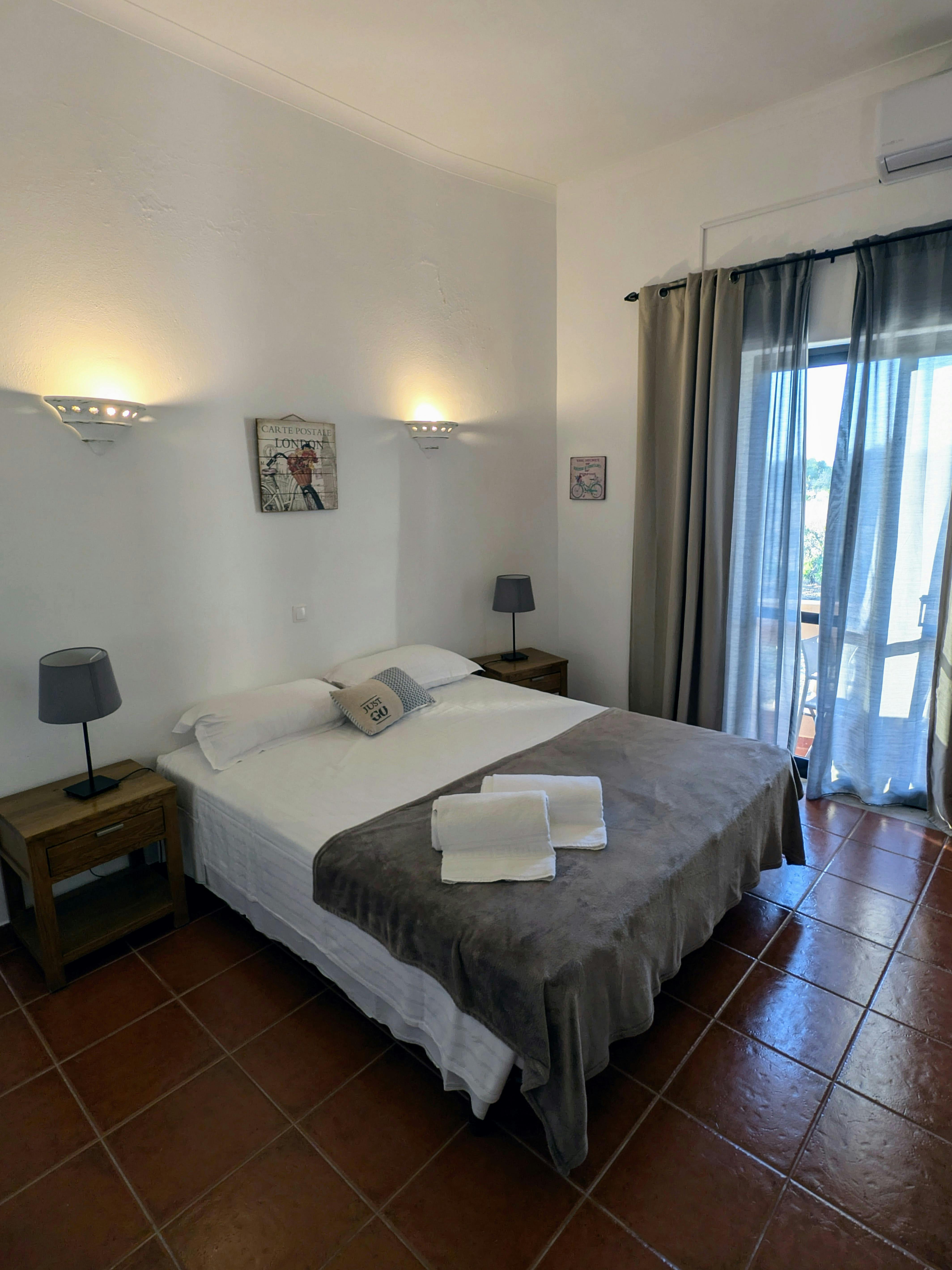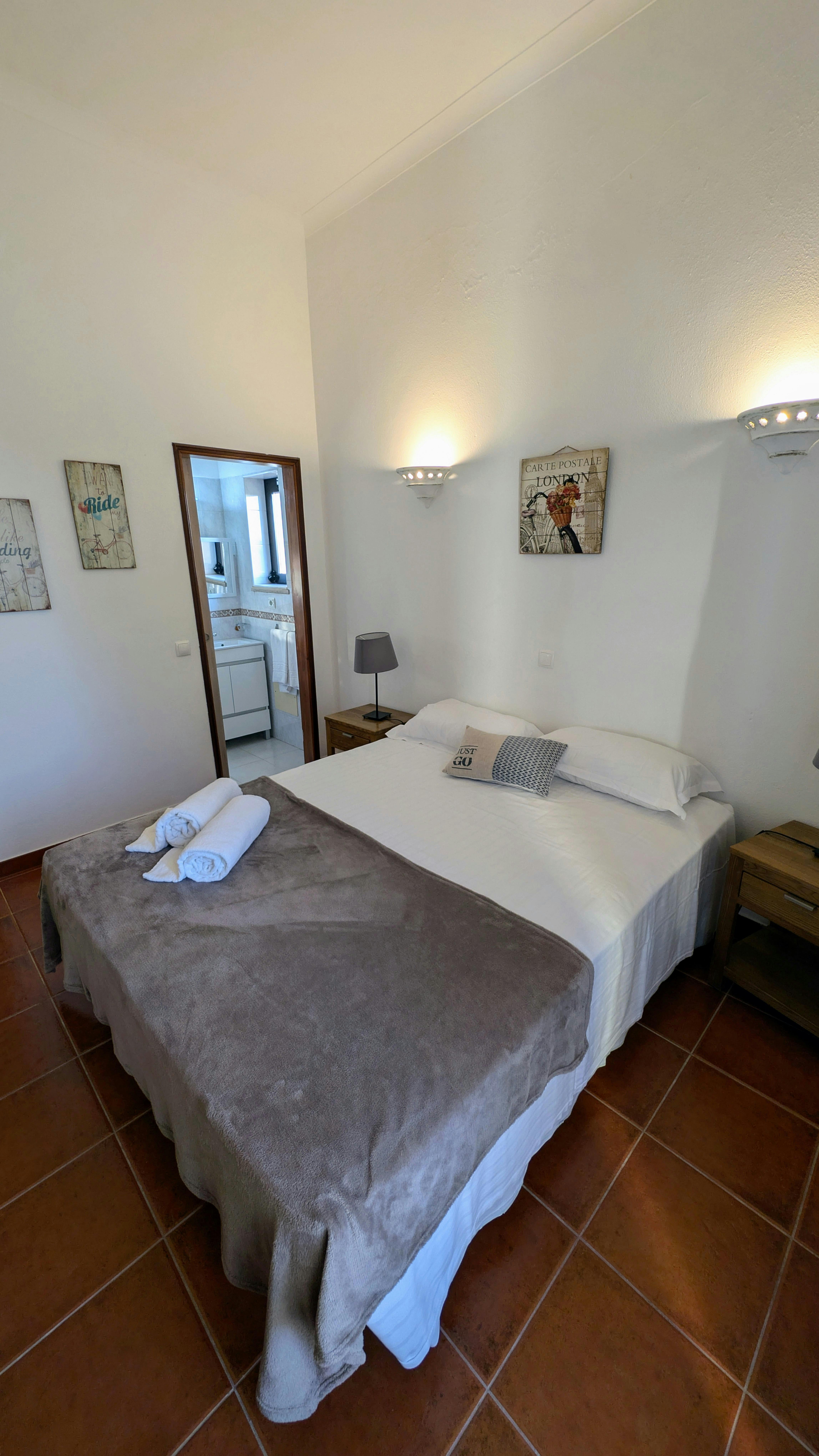 Este quarto é ligeiramente mais pequeno, mas acolhedor, equipado com ar condicionado, Wi-Fi, televisão, casa de banho privativa e um mini-frigorífico para maior conveniência. Com vista aberta para o campo, é o cenário perfeito para relaxar ao final do dia. A orientação solar permite desfrutar de pores do sol deslumbrantes directamente da varanda — um verdadeiro privilégio para os amantes da natureza.